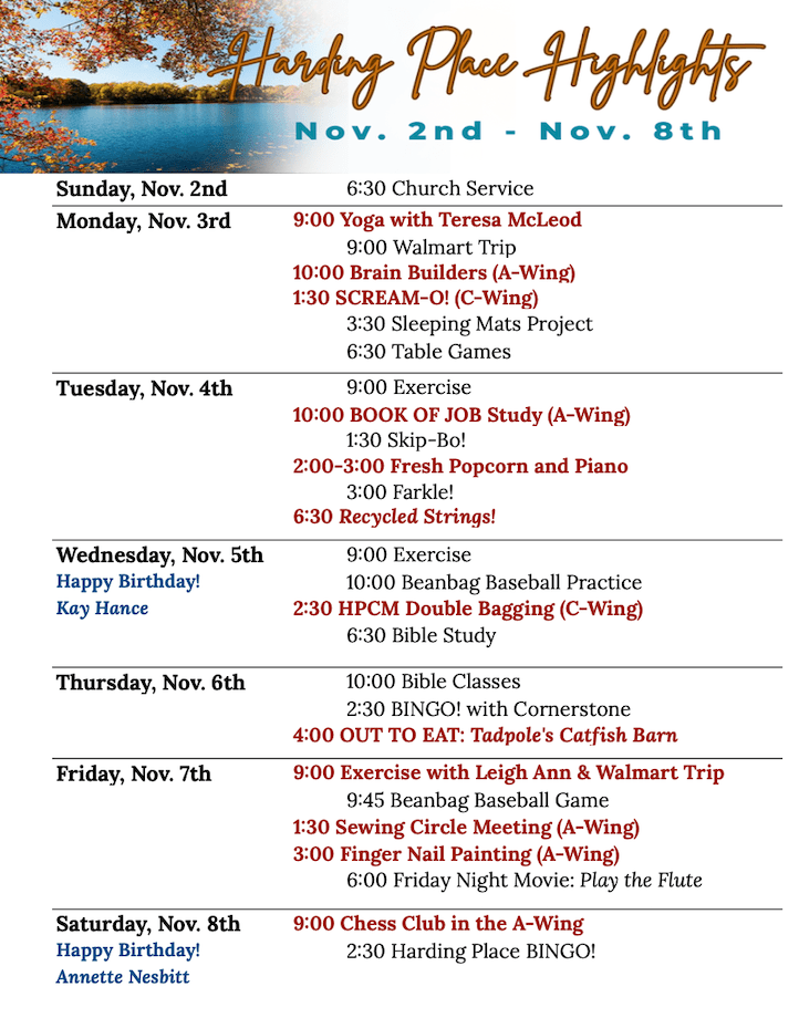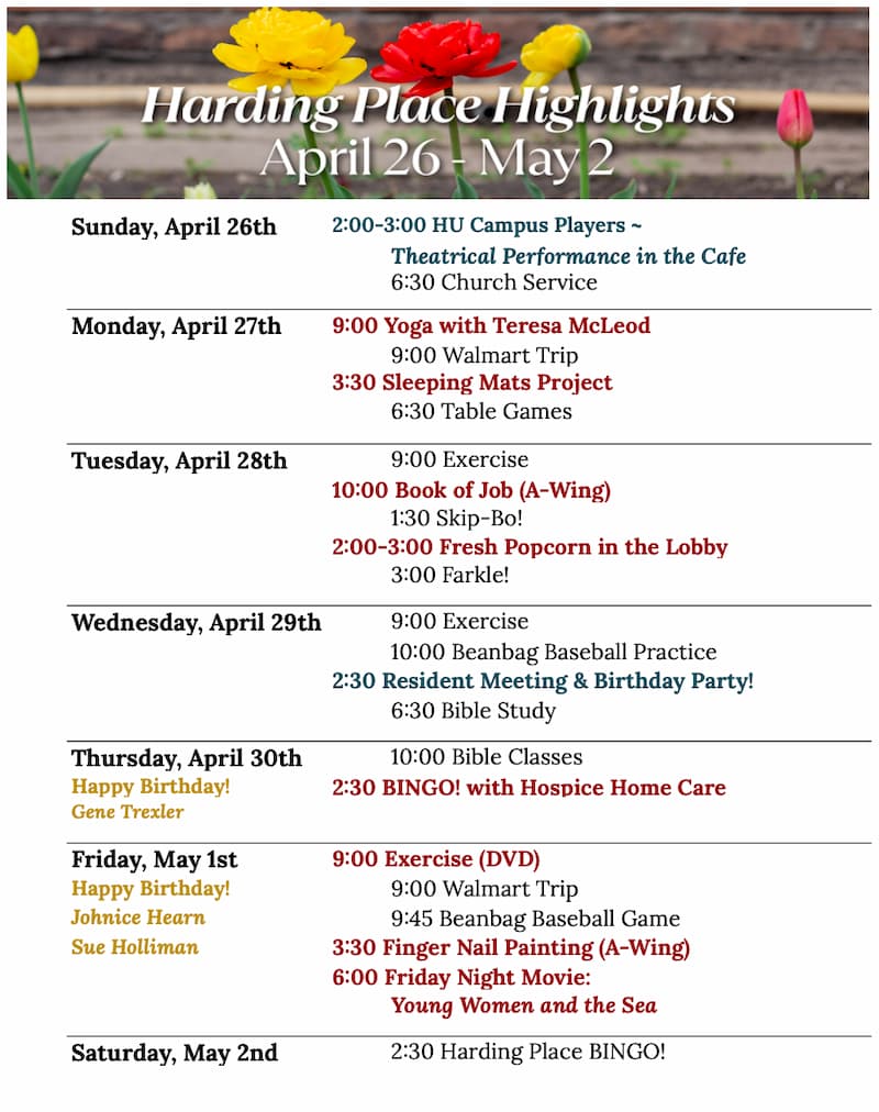 Harding Place is nestled in the heart of Searcy, AR and located right on Harding University’s campus. Within minutes, residents can be to area restaurants, shopping, movies, art gallery, golf courses, and local theater. With Searcy’s thriving art scene, seasonal festivals, and Harding University’s many events, our residents enjoy their retirement to the fullest.