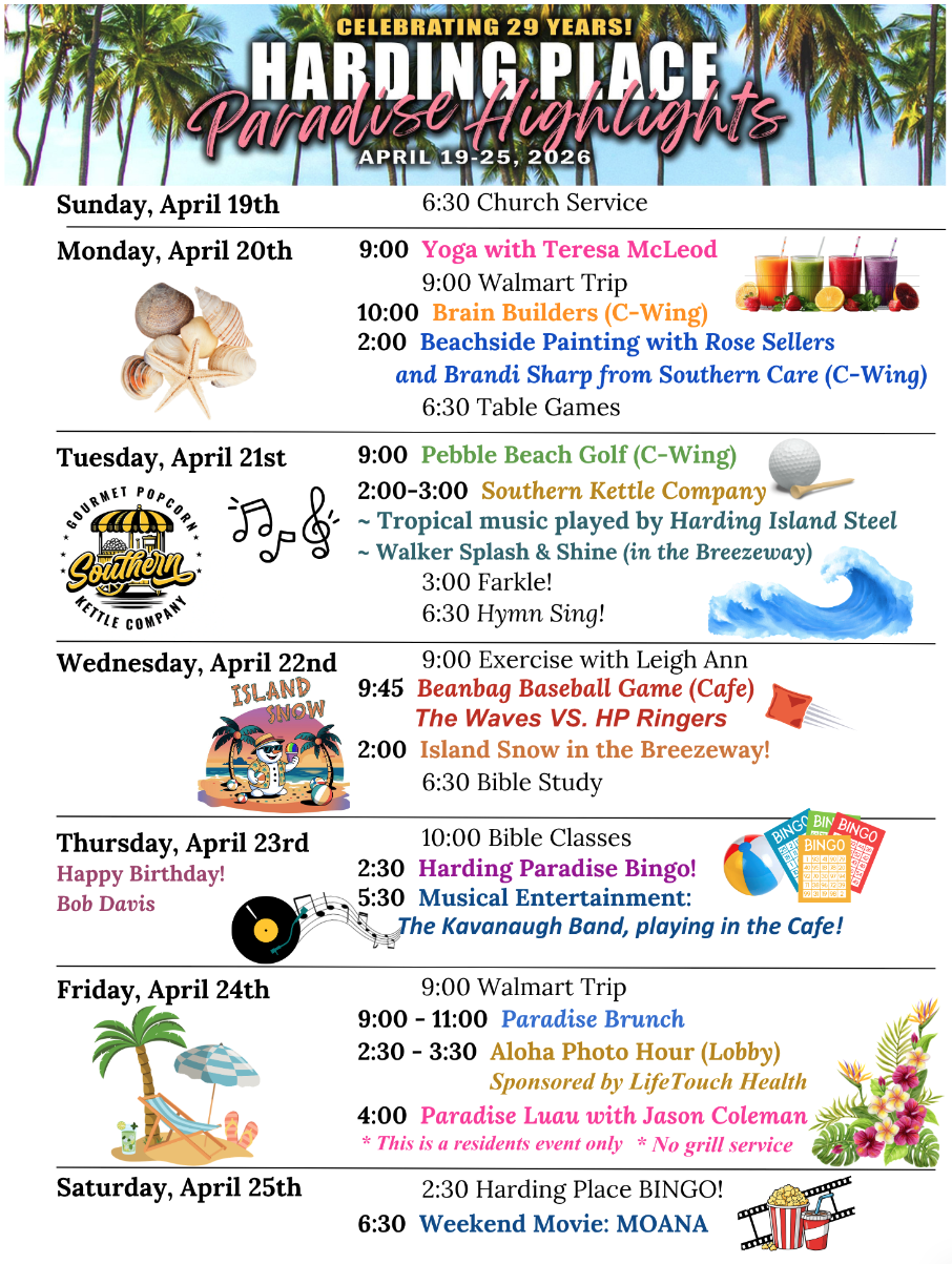 “My husband and I have looked for a long time for a place we wanted to stay for the rest of our lives….and found it the minute we stepped into the lobby at Harding Place Retirement Center. We felt ‘home and family.’ Harding Place is a lovely and appealing place, but it’s staff and residents give it its heart. Thanks and appreciation to all.”